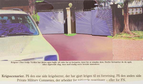 Bonde’s paintings portray several unsolved situations, and the complex problems that come with them – as reflected in the locations that provide the backdrops of social unrest and war: Iraq, Sharm-Al-Sheikh, Nepal, Congo, every single one is like an open wound. But his work can’t be reduced to mere social commentary, it has other qualities. As paintings, they are hybrids of artistic craft and digital technology, the mere painting over of the unpleasant hard fact reveals the actual flatness of the news image.The really hard fact is that the consumer of news hardly knows anything about the soft facts – the location, the people involved, the historic roots of the conflict.The images of the places without the main protagonists appear interchangeable, turning the images into a cynical game of Karaoke, letting the viewer fill in what happened where. In earlier paintings Bonde applied this treatment to a variety of well known public figures in an act of artistic elimination, as if to ask: wouldn’t the world be a better place without these people?