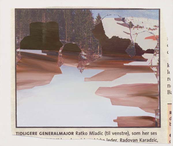 Dealing with erasure and disappearance, Bonde’s work is also about forgetfulness and memory, raising the issue of how shadows of historic images shape the consciousness of the present. With the figures removed, the background of the news images turns into a landscape, the backdrop of before and after an event, with an occasional spectator in the image watching a non-event of ghostly outlines, paint textures with slightly different colours and the odd “lost” detail. Questions of historical visibility or invisibility are addressed, but they also point out the power of a culture based on images, and the desire to find the eminence of the ” real ” in the human body of the protagonist.The practices of image making in the news take this into account, and the artist invites his audience to reflect on the conditions that define both spectacle and spectator.